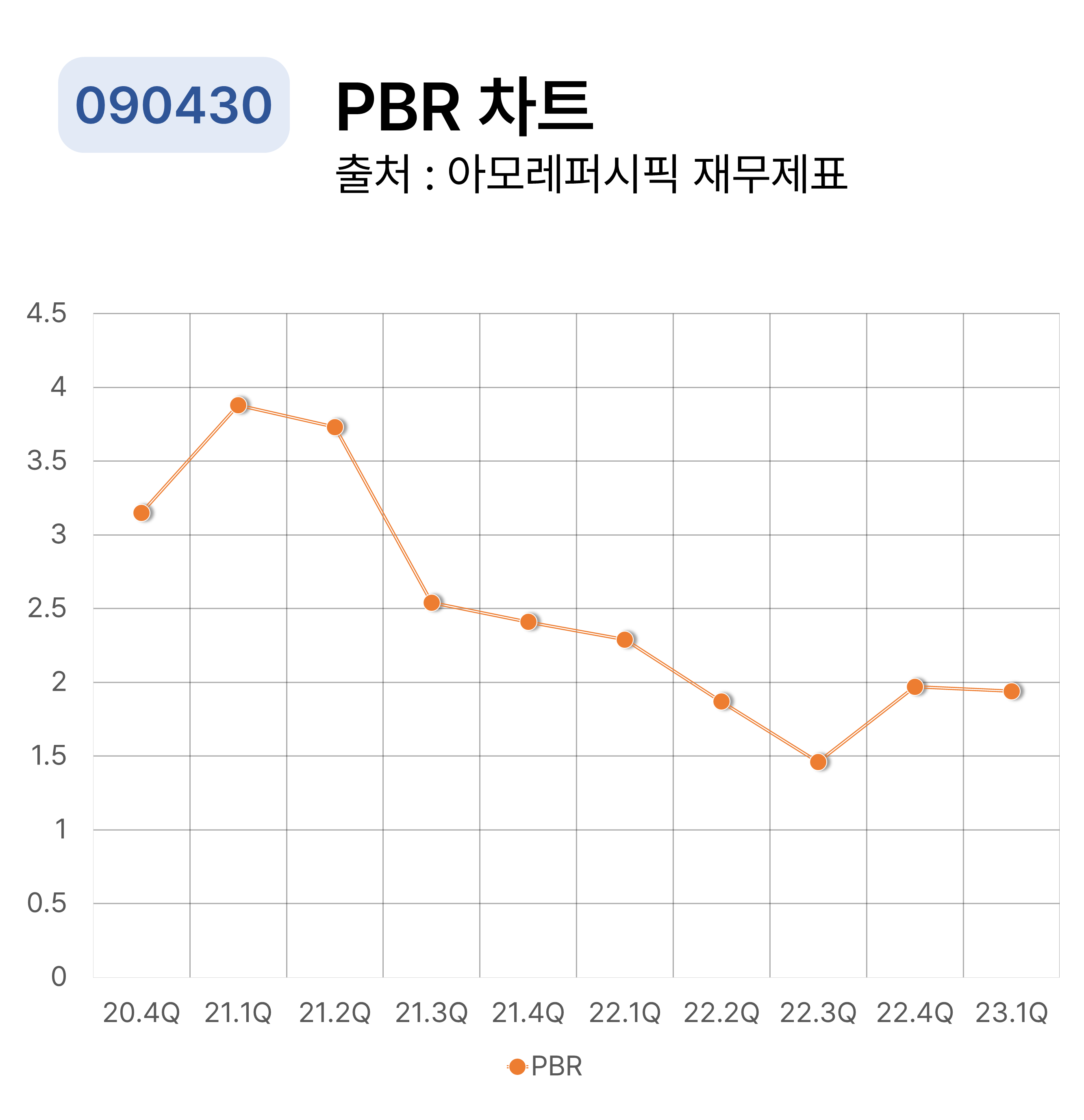 PBR은 기업이 가진 자산가치를 통해 계산되는 지표이며 PBR은 주가를 1주당 순자산으로 나눈 수치로써 부동산, 현금 등 기업이 가진 모든 보유자산이 평가 대상으로 사용됩니다. 아모레퍼시픽의 PBR는 2021년 1분기에 최대 수치를 기록합니다.