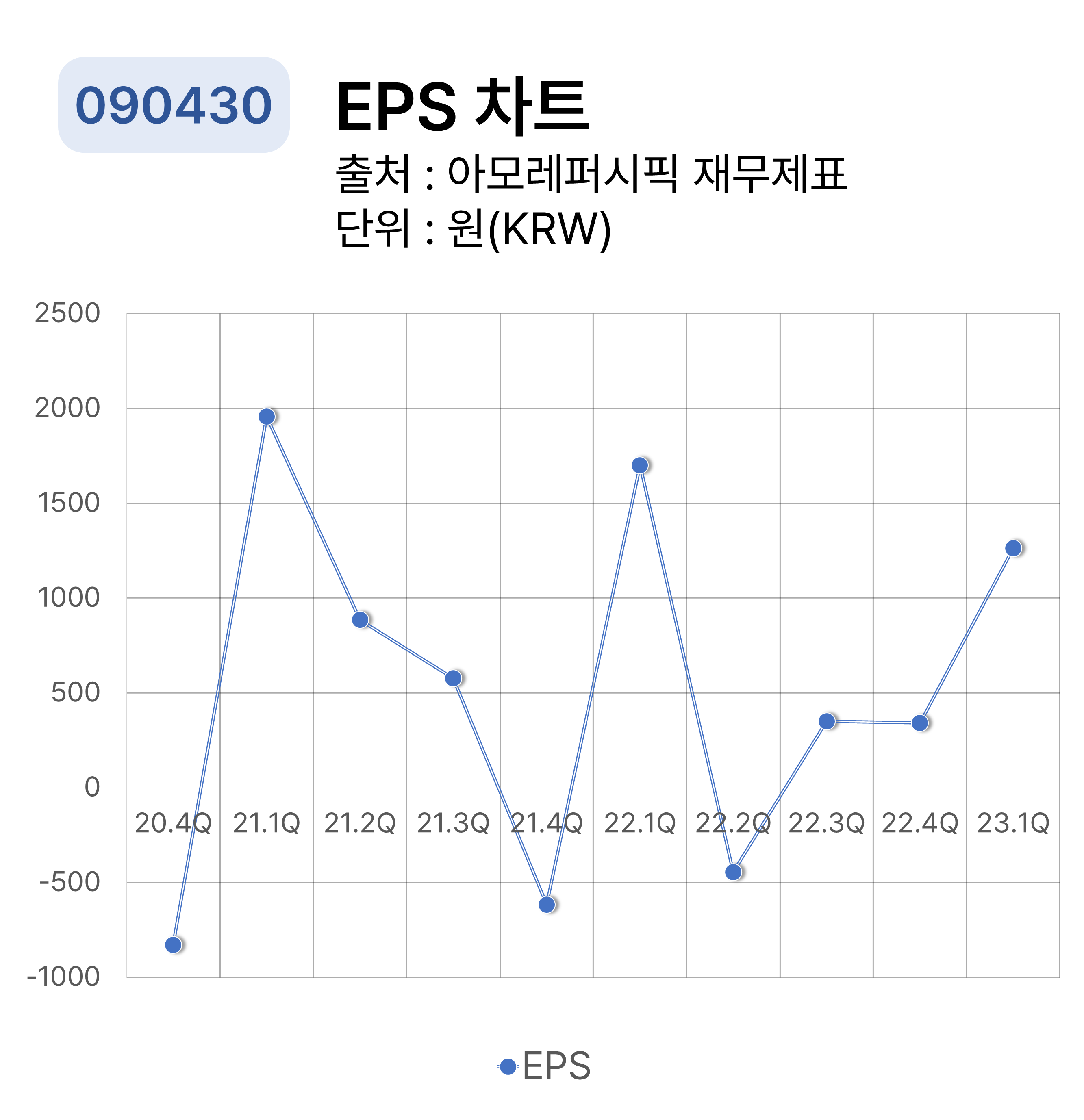아모레퍼시픽의 분기별 영업이익 차트입니다. 2021년 1분기에 최대 영업이익을 달성했습니다. 2022년 2분기에 최저 영업이익을 기록했습니다.