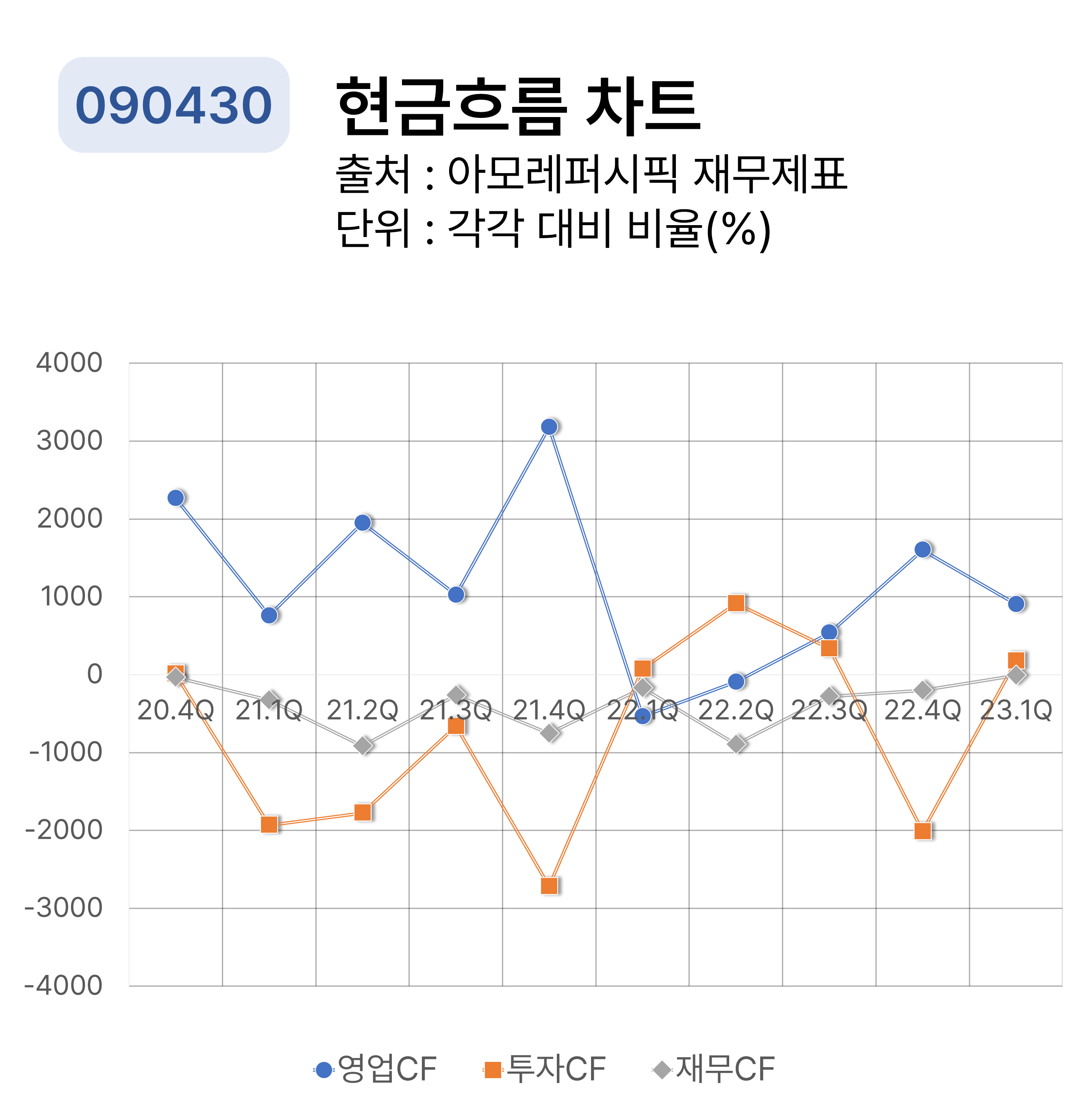 아모레퍼시픽의 분기별 현금흐름 차트입니다. 주식투자에 있어서 현금흐름표를 분석할 때에 단순히 증가 및 감소로만 파악해서는 안 되며 원인을 면밀히 확인해야 할 것입니다. 주식투자에 있어서 현금흐름이 중요한 이유는 실적이 좋은 기업이라도 현금흐름이 악화되면 부도의 가능성이 높아질 수 있기 때문이죠.