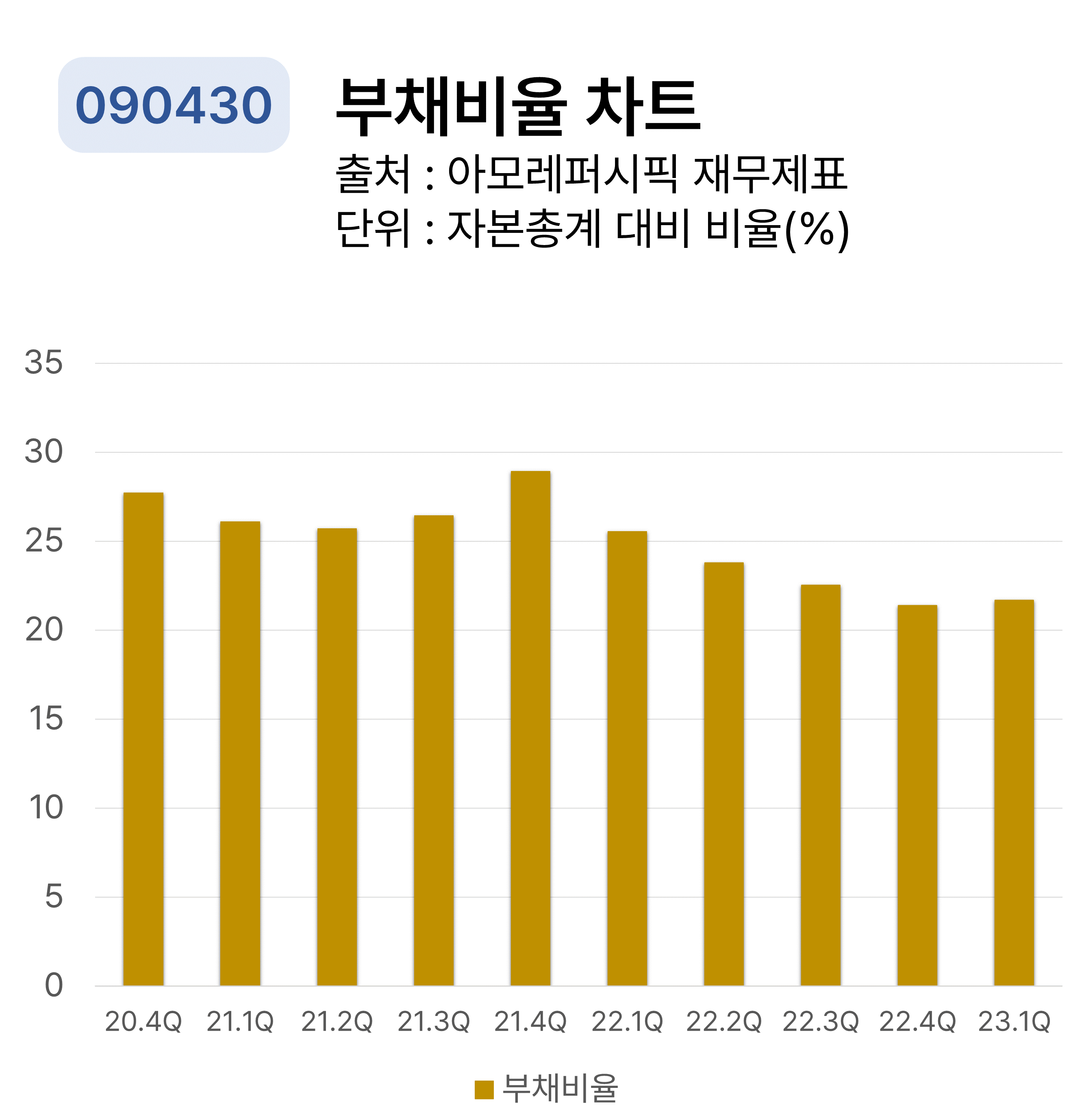 아모레퍼시픽의 분기별 부채비율 차트입니다. 가장 최근에는 2021년 4분기에 최대 부채비율을 기록했습니다. 2022년 4분기에 최소 부채비율을 기록합니다.