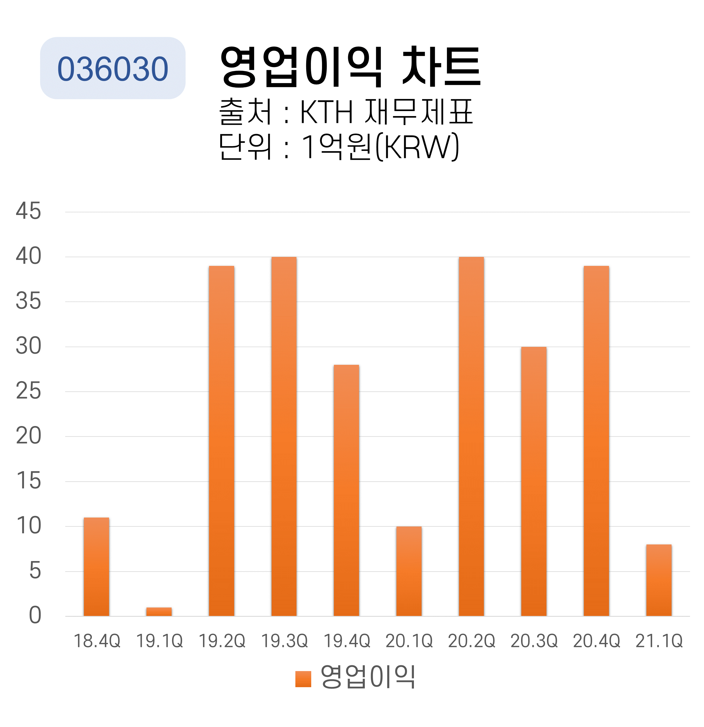 KTH의 분기별 영업이익 차트입니다. 2019년 3분기와 2020년 2분기에 최대 영업이익을 달성했습니다. 2019년 1분기에 최저 영업이익을 기록했습니다.