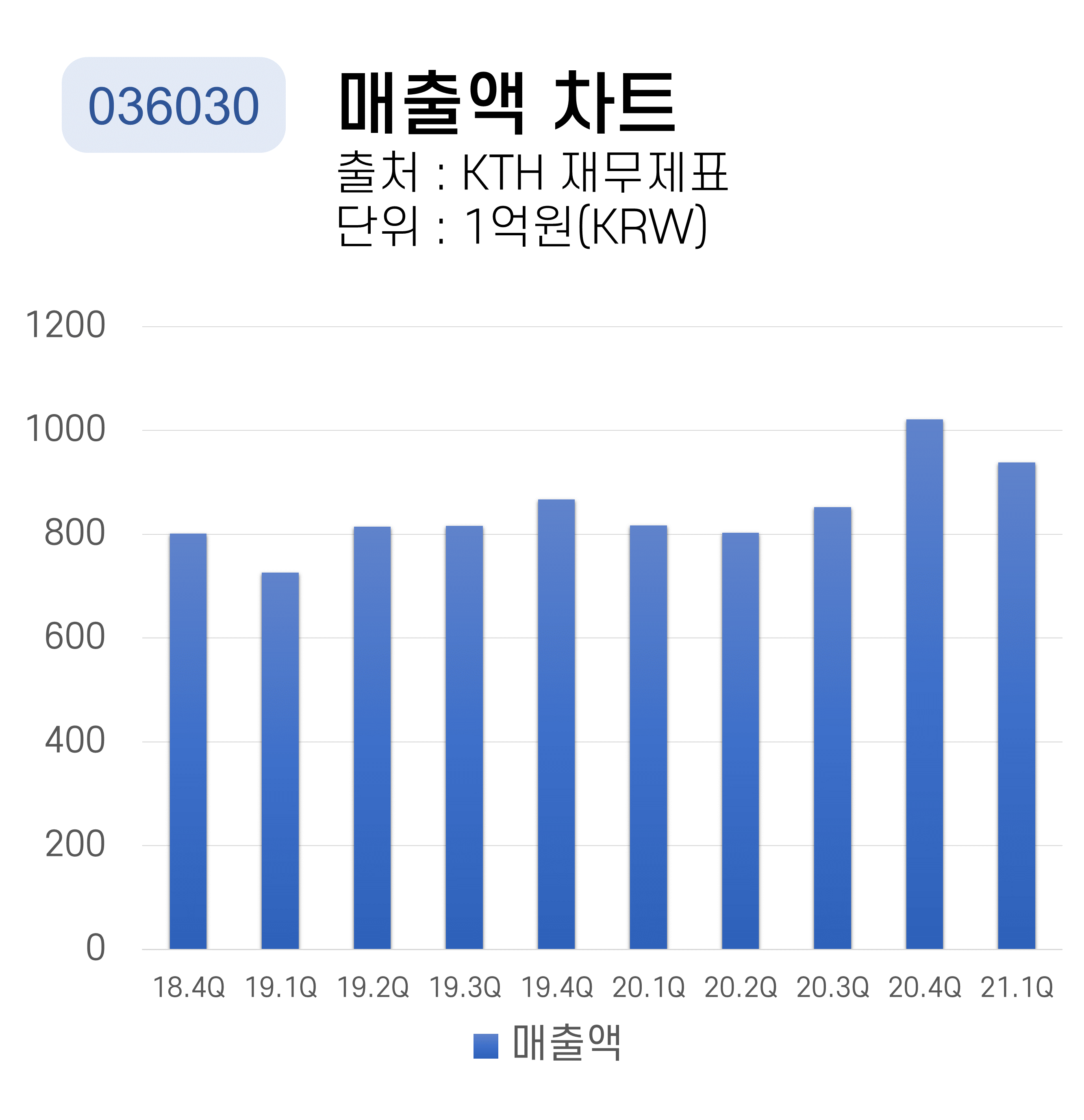 KTH의 분기별 매출액 차트입니다. 2020년 4분기에 최대 매출액을 달성했습니다. 그 직전인 2020년 3분기에 비해 매출액이 상당히 큰 폭으로 성장했습니다.