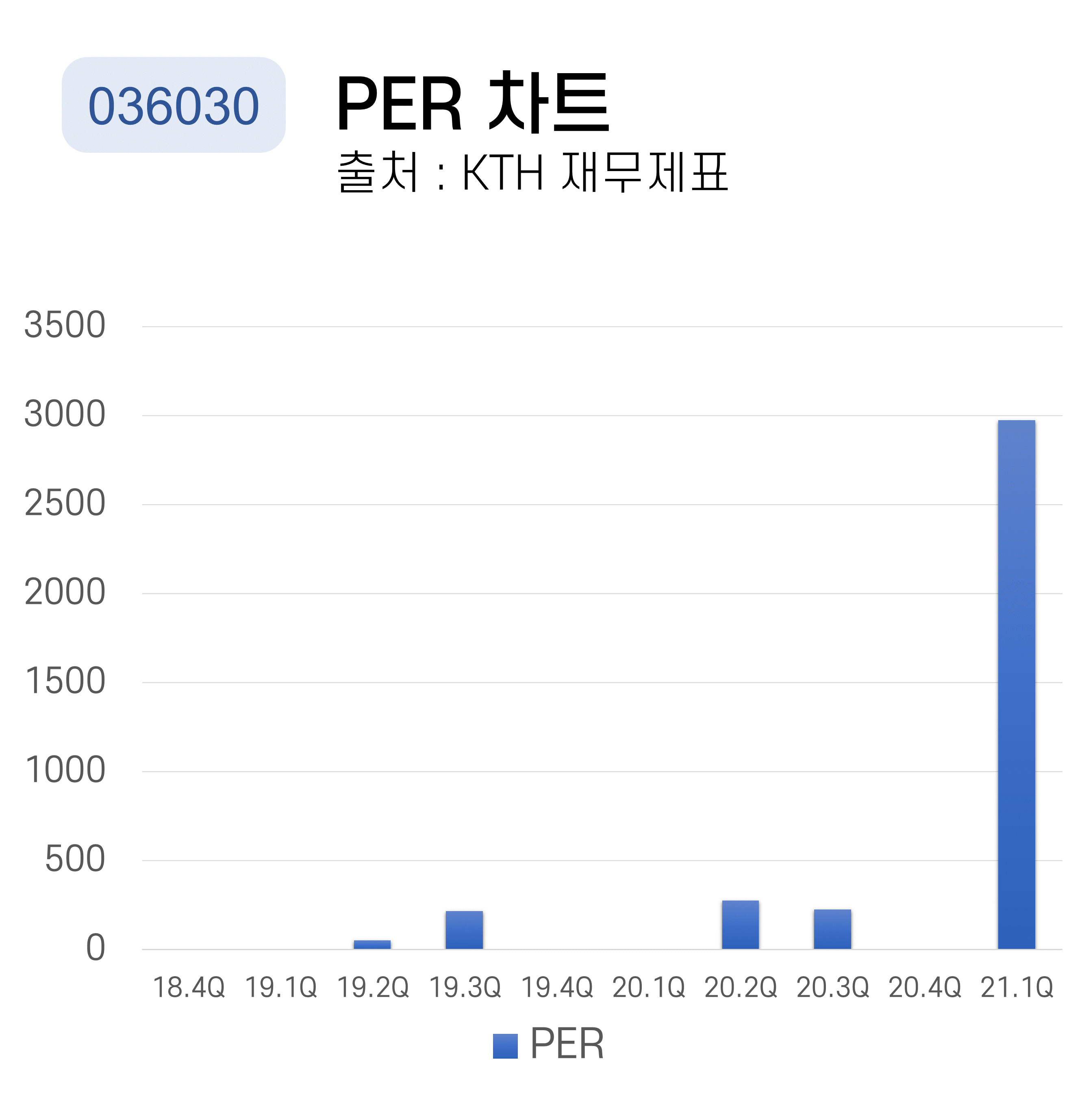 PER은 주가를 주당순이익(EPS)으로 나눈 수치이며 주가가 주당순이익과 비교해 몇 배 수준의 가격을 형성하고 있는지를 판단함으로써, 다소 비싼 가격인지, 저평가되었는지를 판단합니다. 최근 KTH의 PER은 상당히 높은 수준입니다.
