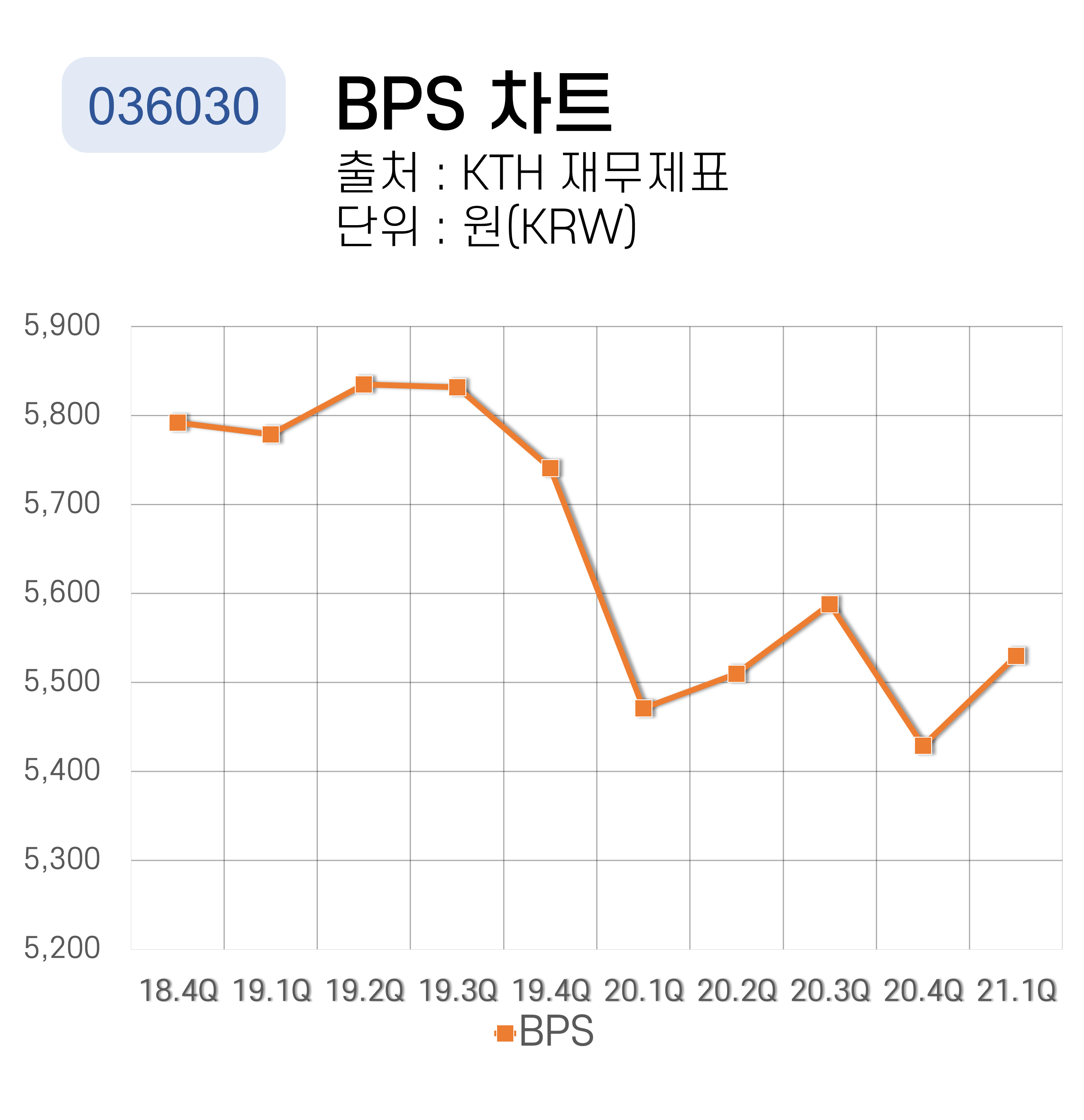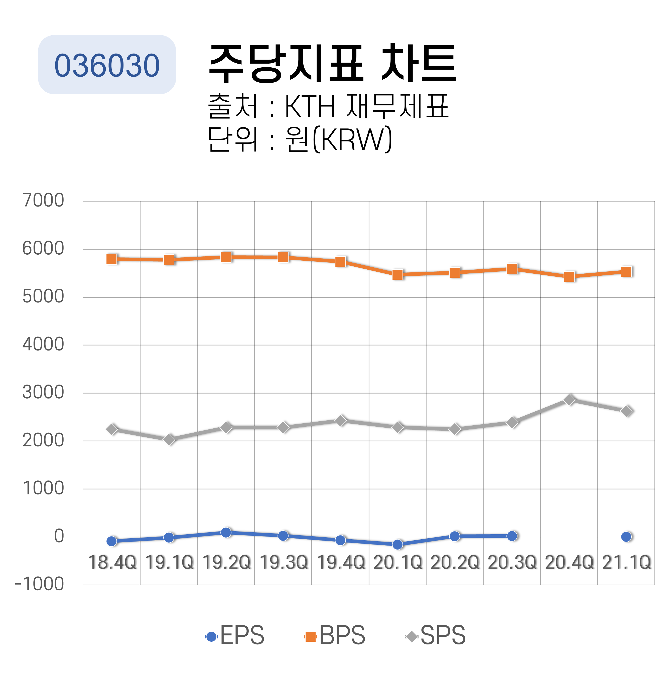 KTH의 주당지표를 총평하겠습니다. EPS 지표와 SPS 지표는 횡보 중이지만 BPS 지표는 하락 추세입니다.