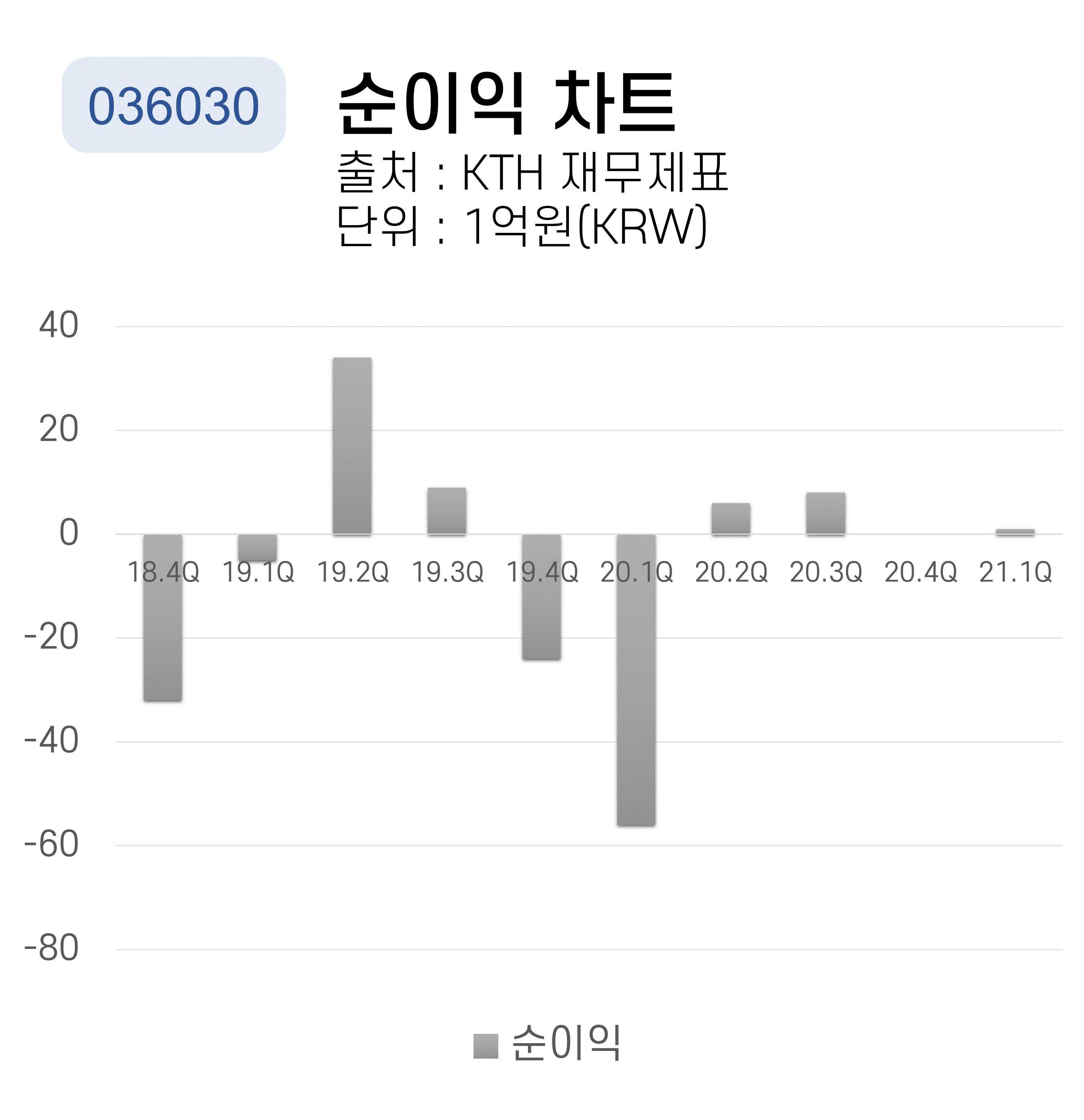 KTH의 분기별 순이익 차트입니다. 2019년 2분기에 최대 순이익을 달성했습니다. 2020년 4분기의 자료는 누락되어 표기하지 않았습니다. 2020년 1분기에 최저 순이익을 기록했습니다.